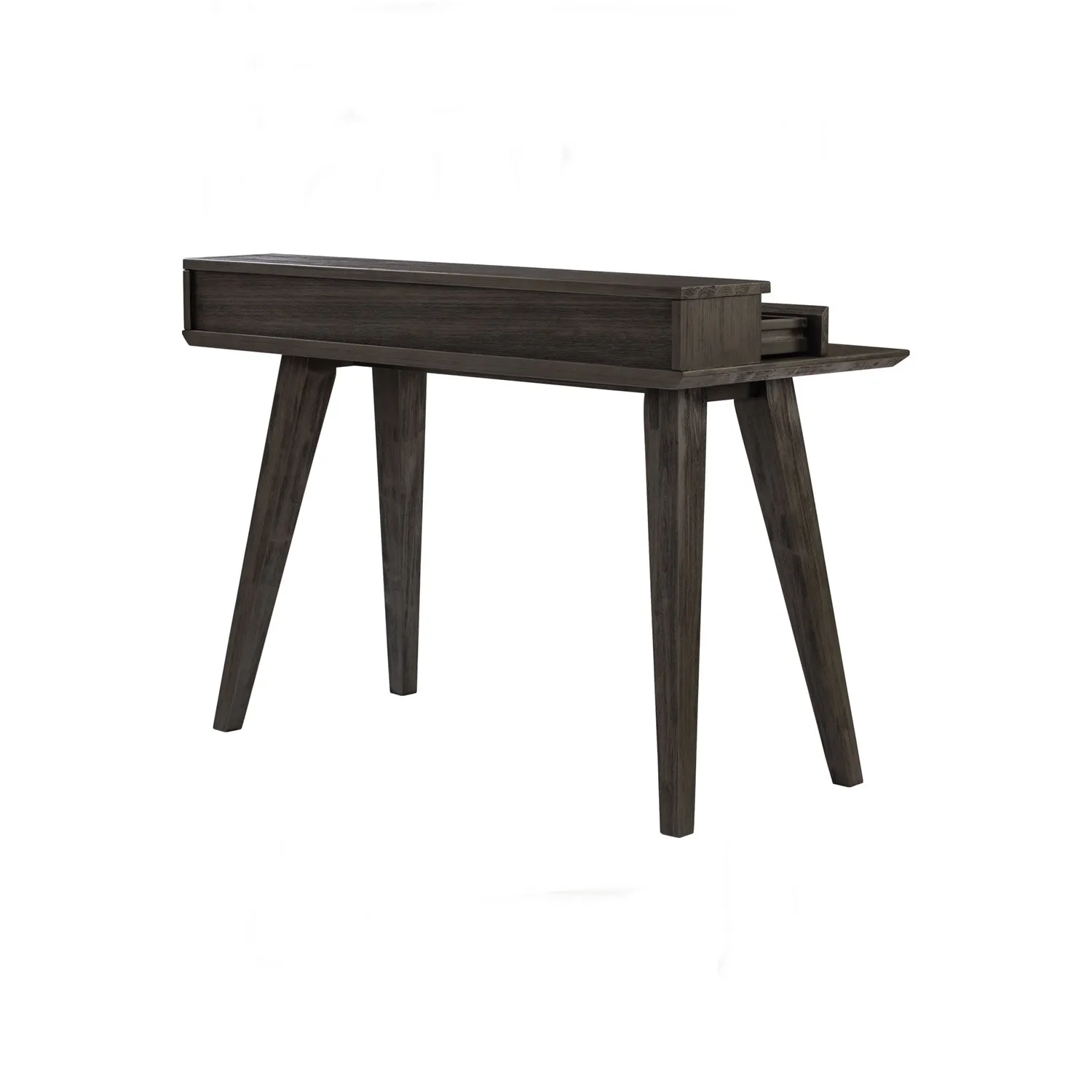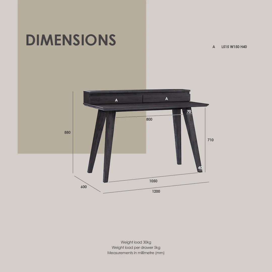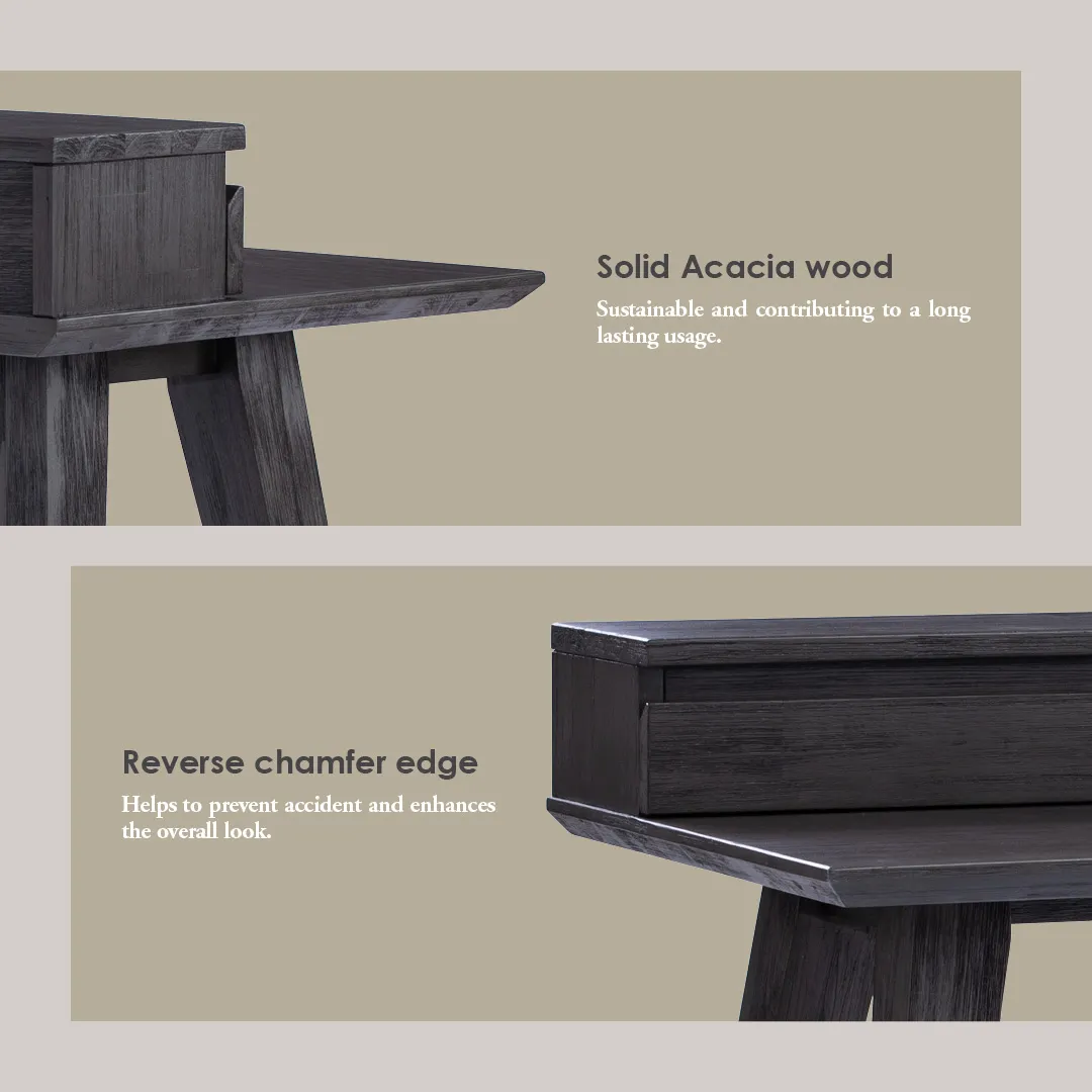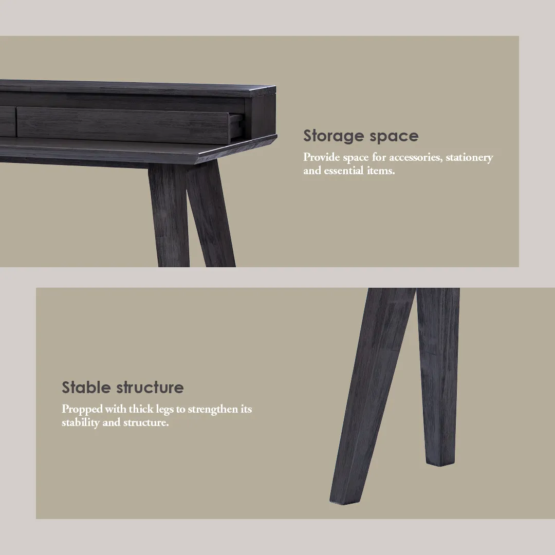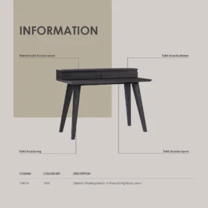 Dabney Working Desk in Anthracite Highland colour. The Dabney Working Desk blends Mid-Century Modern design with Rustic character, creating a workspace that is both practical and stylish. Crafted from solid acacia wood with an acacia veneer top, it emphasizes natural textures and durability. The sturdy construction and timeless silhouette ensure long-lasting performance, while the warm, organic finish enhances its inviting aesthetic. With its straightforward form and refined details, the Dabney Desk adapts effortlessly to both contemporary homes and rustic-inspired interiors. It provides a functional surface for work while contributing a sense of authenticity and warmth to any space.