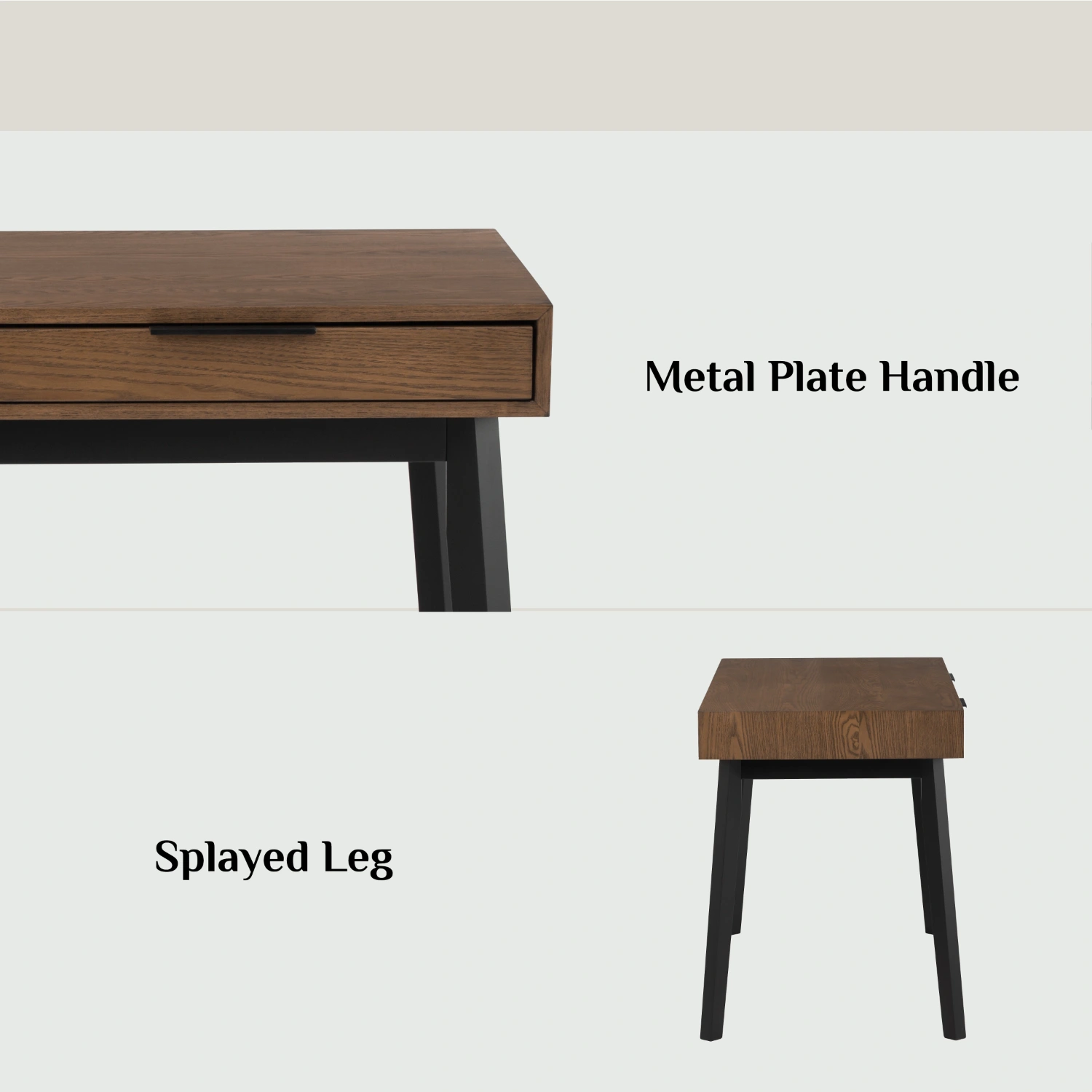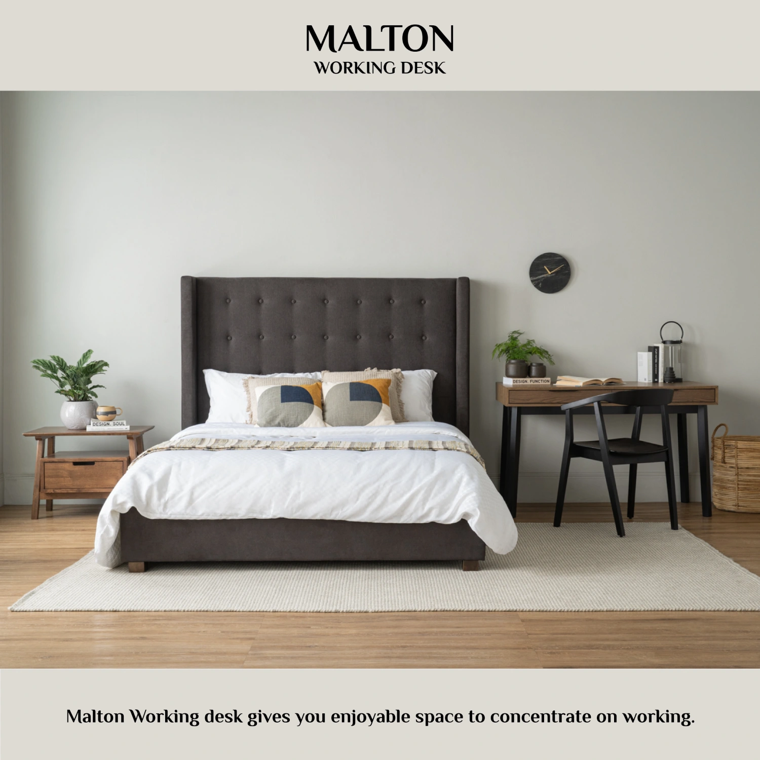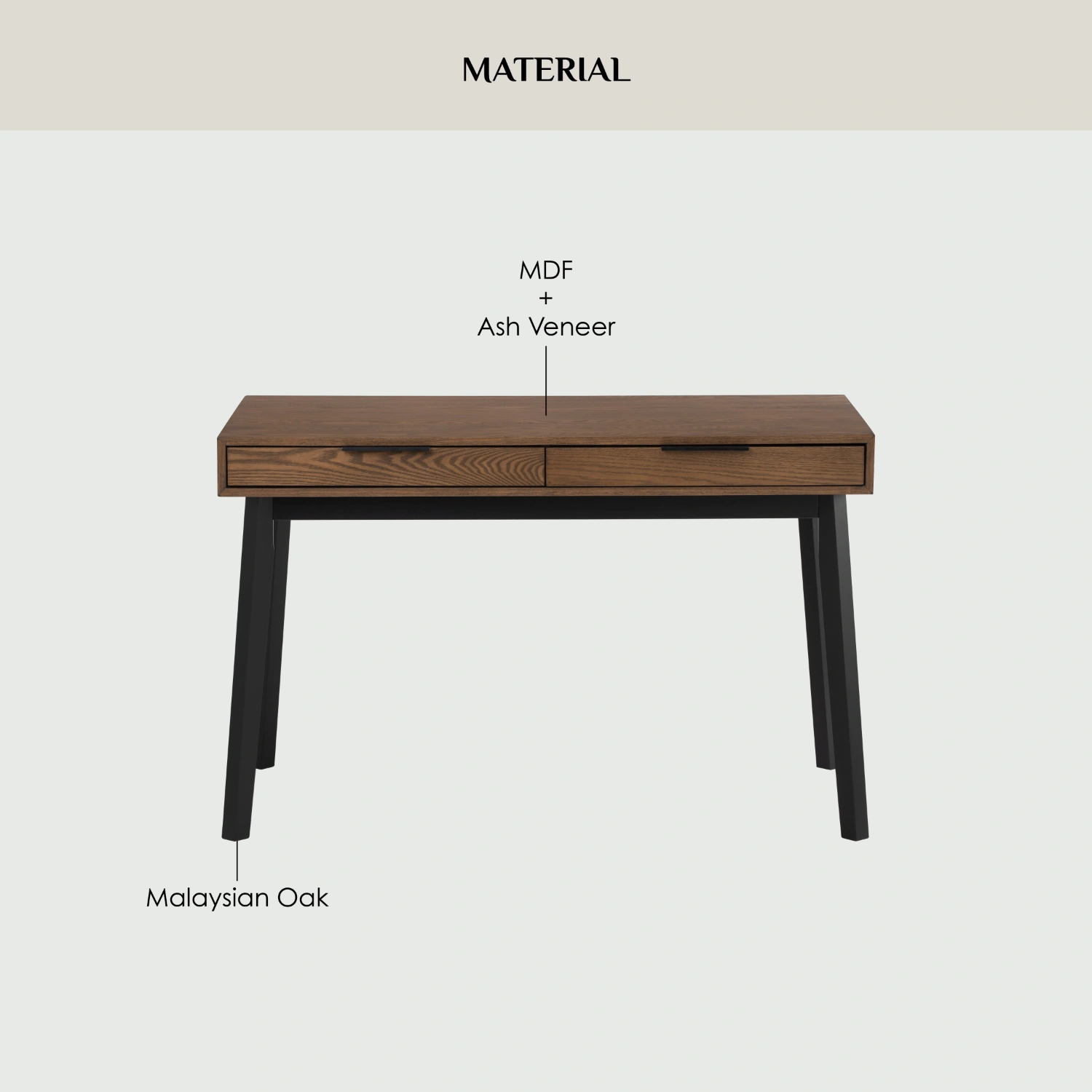 Malton working desk in Black colour leg, Cocoa colour top. The Malton Working Desk reflects Mid-Century Modern style enriched with Rustic undertones, offering a versatile and durable piece for contemporary interiors. Supported by Malaysian oak legs and topped with ash veneer, it brings together natural beauty and solid craftsmanship. Its clean lines and understated form allow it to adapt easily to a variety of spaces, from home offices to creative studios. The Malton Desk is as practical as it is stylish, providing a reliable surface for daily work while adding a sense of warmth and sophistication to its environment.