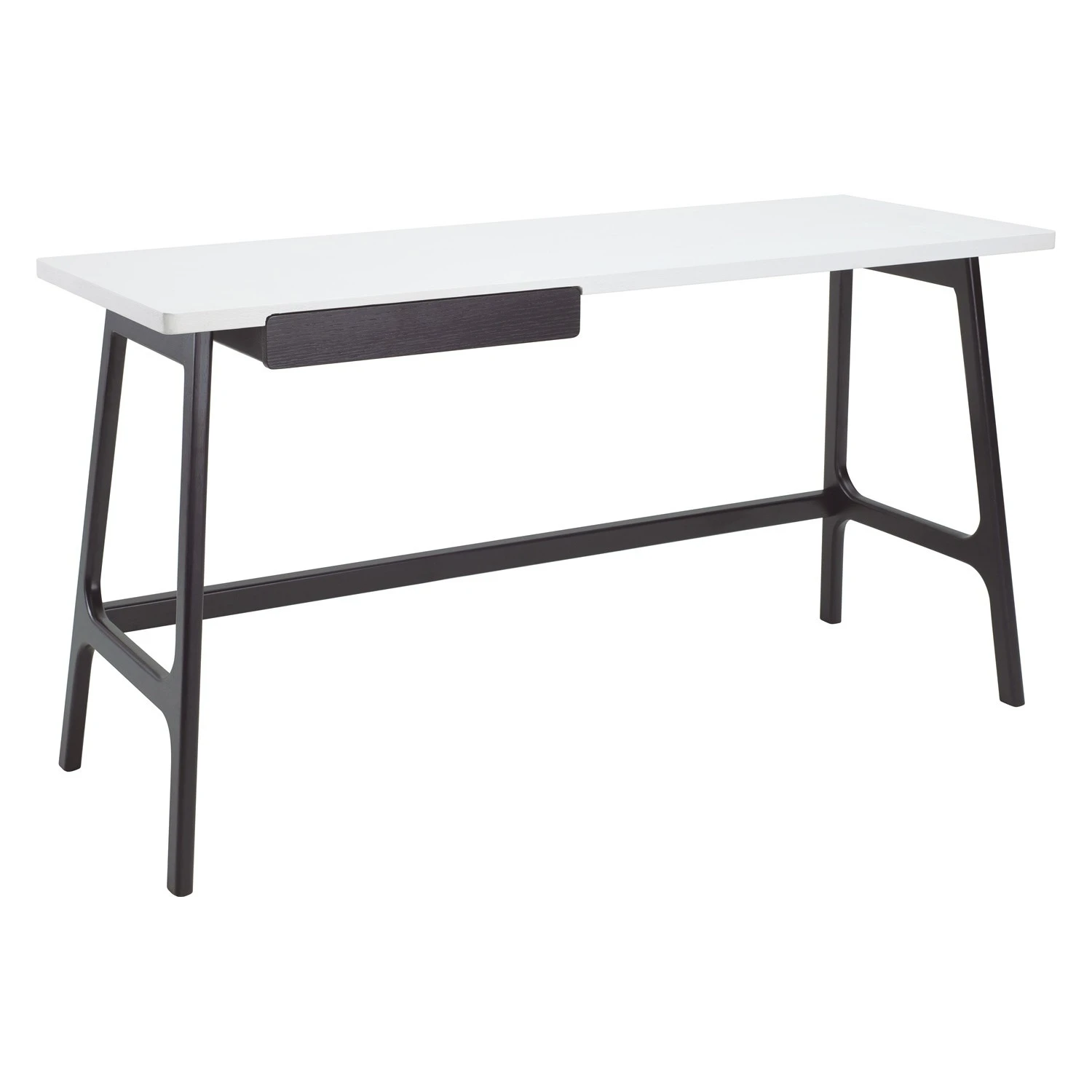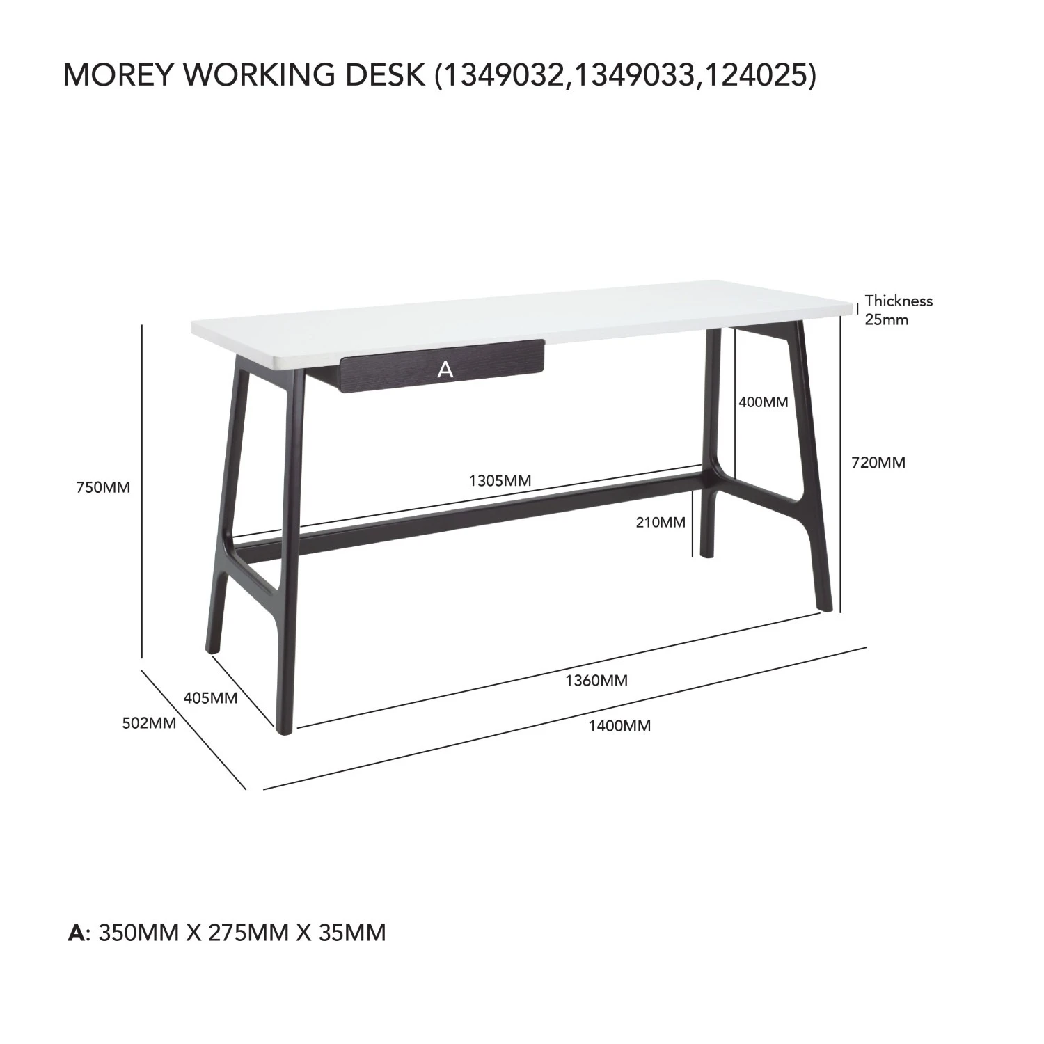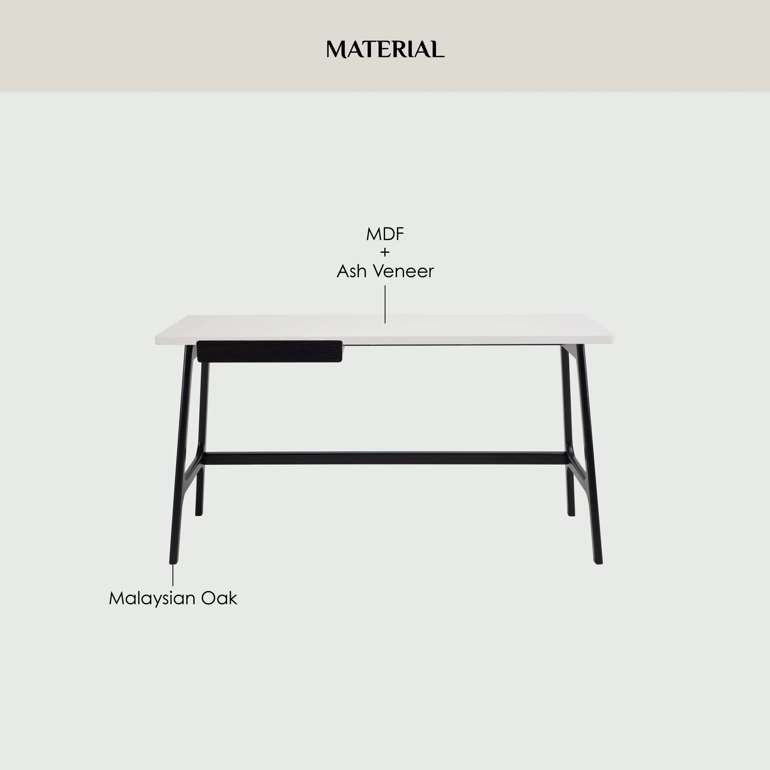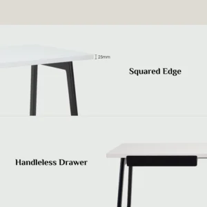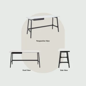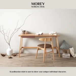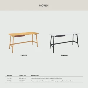 Morey working desk in Black colour leg and White open pore top, Black Ash Veneer drawer. The Morey Working Desk offers minimalist design with striking contrast. Supported by black Malaysian oak legs, it features a white open pore MDF top and a matching black drawer. This combination creates a sleek, modern aesthetic that suits both professional and home environments. The spacious top provides room for work essentials, while the drawer adds discreet storage. With its Mid-Century Modern inspiration, the Morey Desk is a stylish, practical choice for contemporary interiors.
