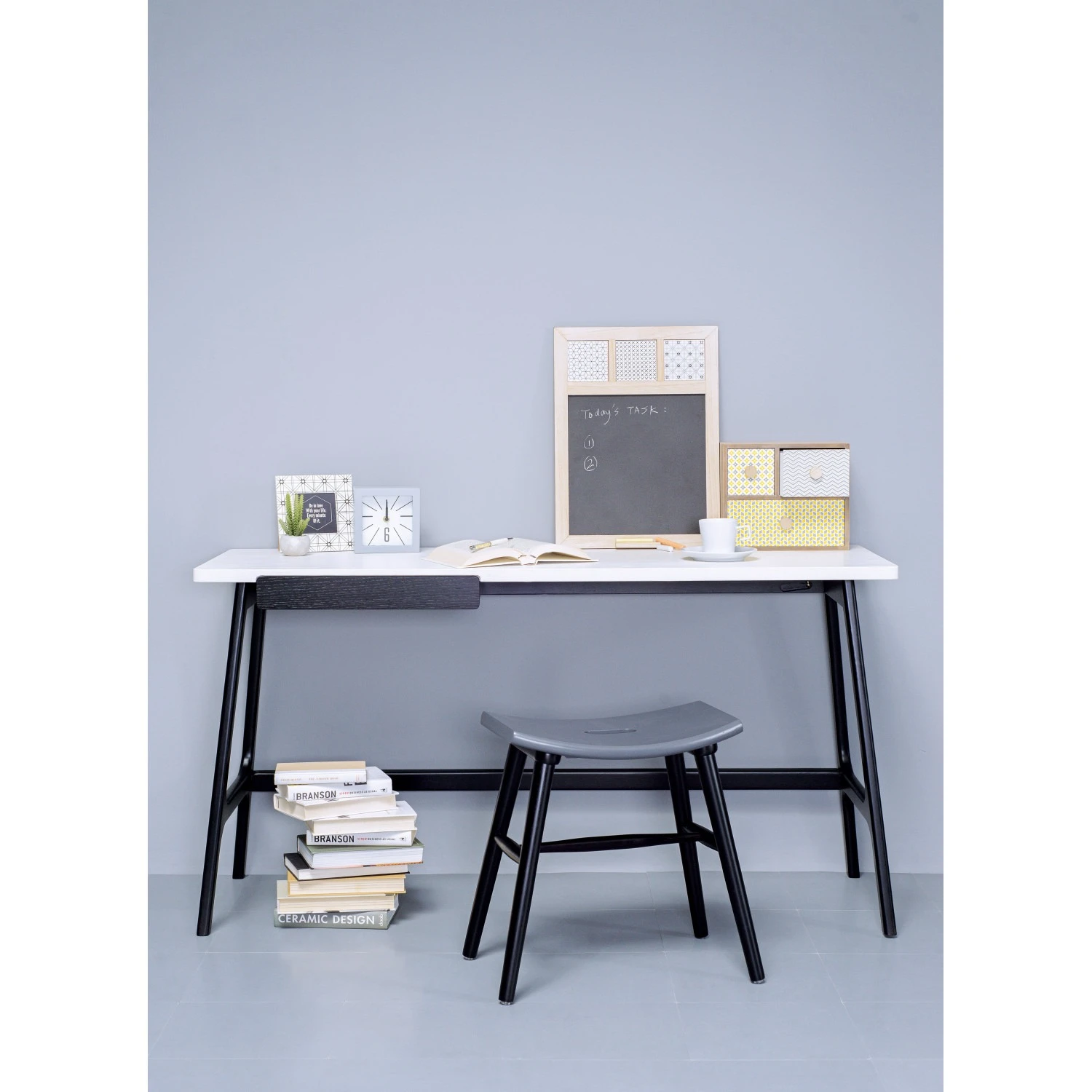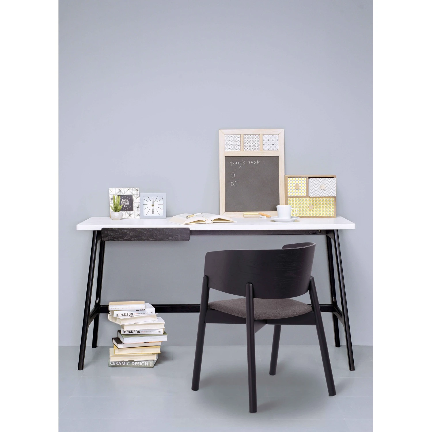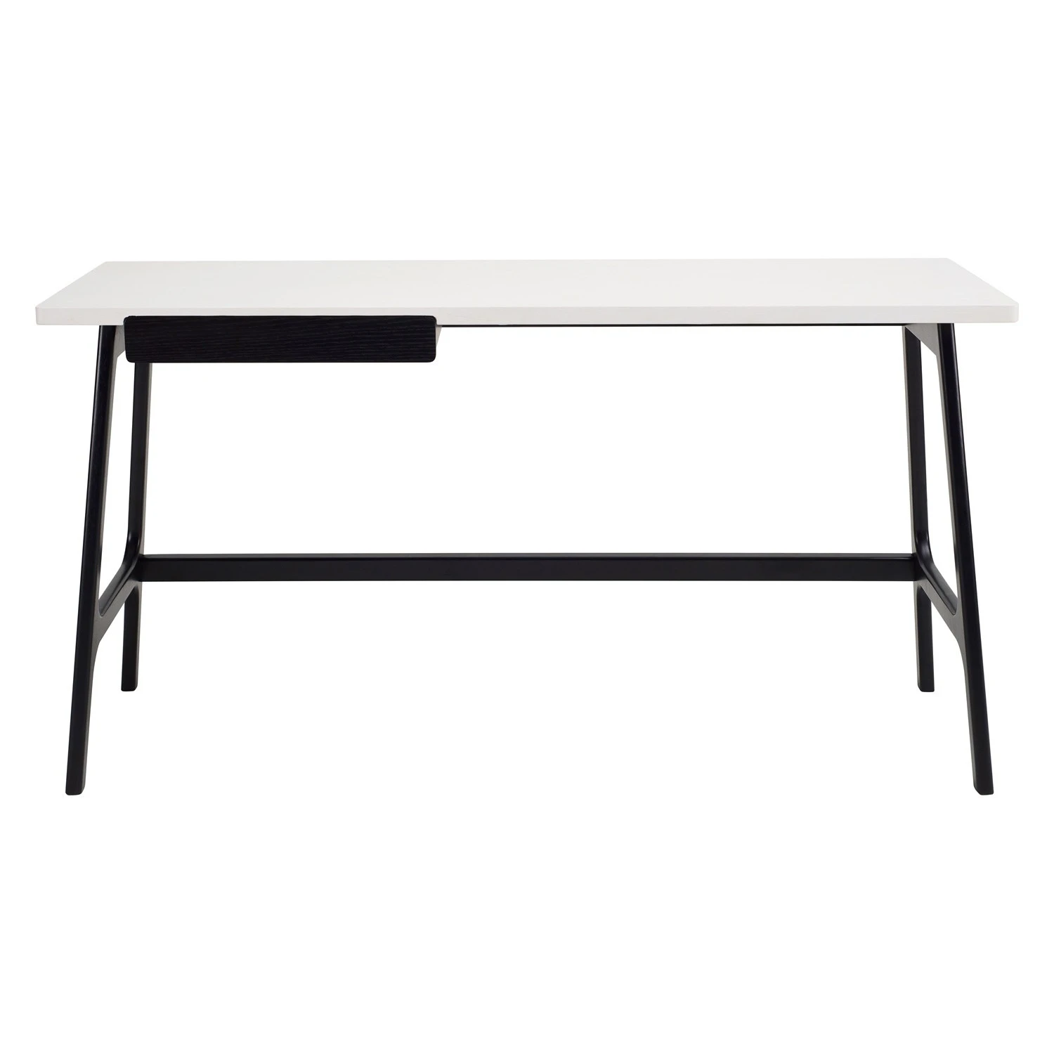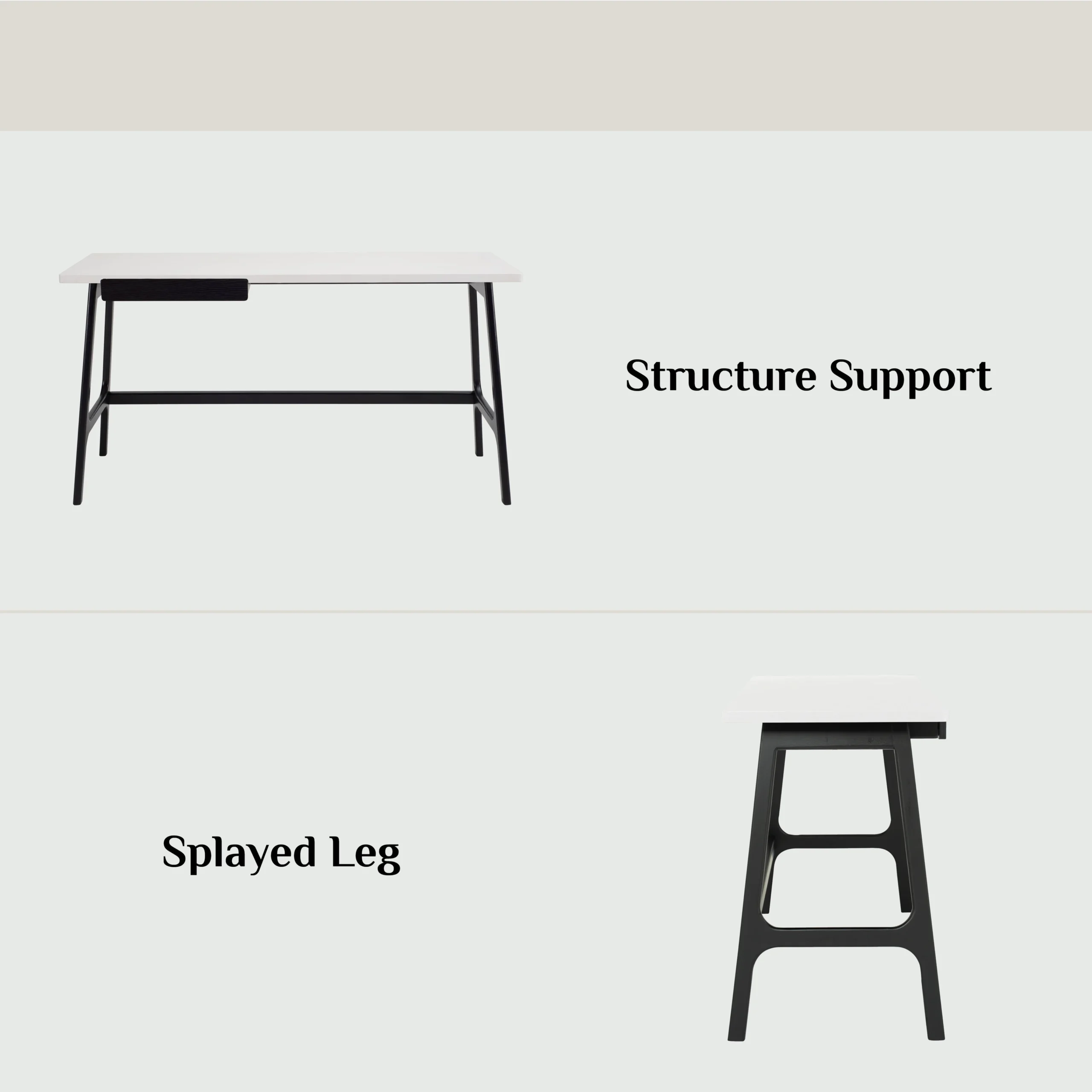 Morey working desk in Black colour leg and White open pore top, Black Ash Veneer drawer. The Morey Working Desk offers minimalist design with striking contrast. Supported by black Malaysian oak legs, it features a white open pore MDF top and a matching black drawer. This combination creates a sleek, modern aesthetic that suits both professional and home environments. The spacious top provides room for work essentials, while the drawer adds discreet storage. With its Mid-Century Modern inspiration, the Morey Desk is a stylish, practical choice for contemporary interiors.