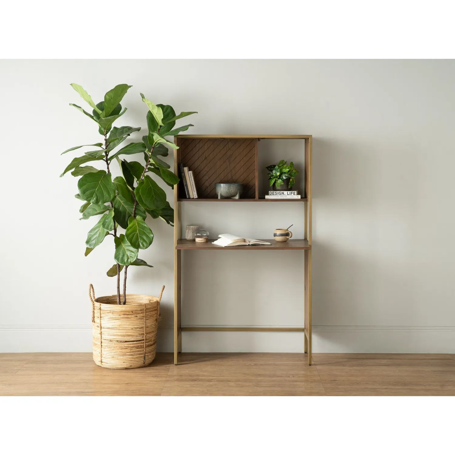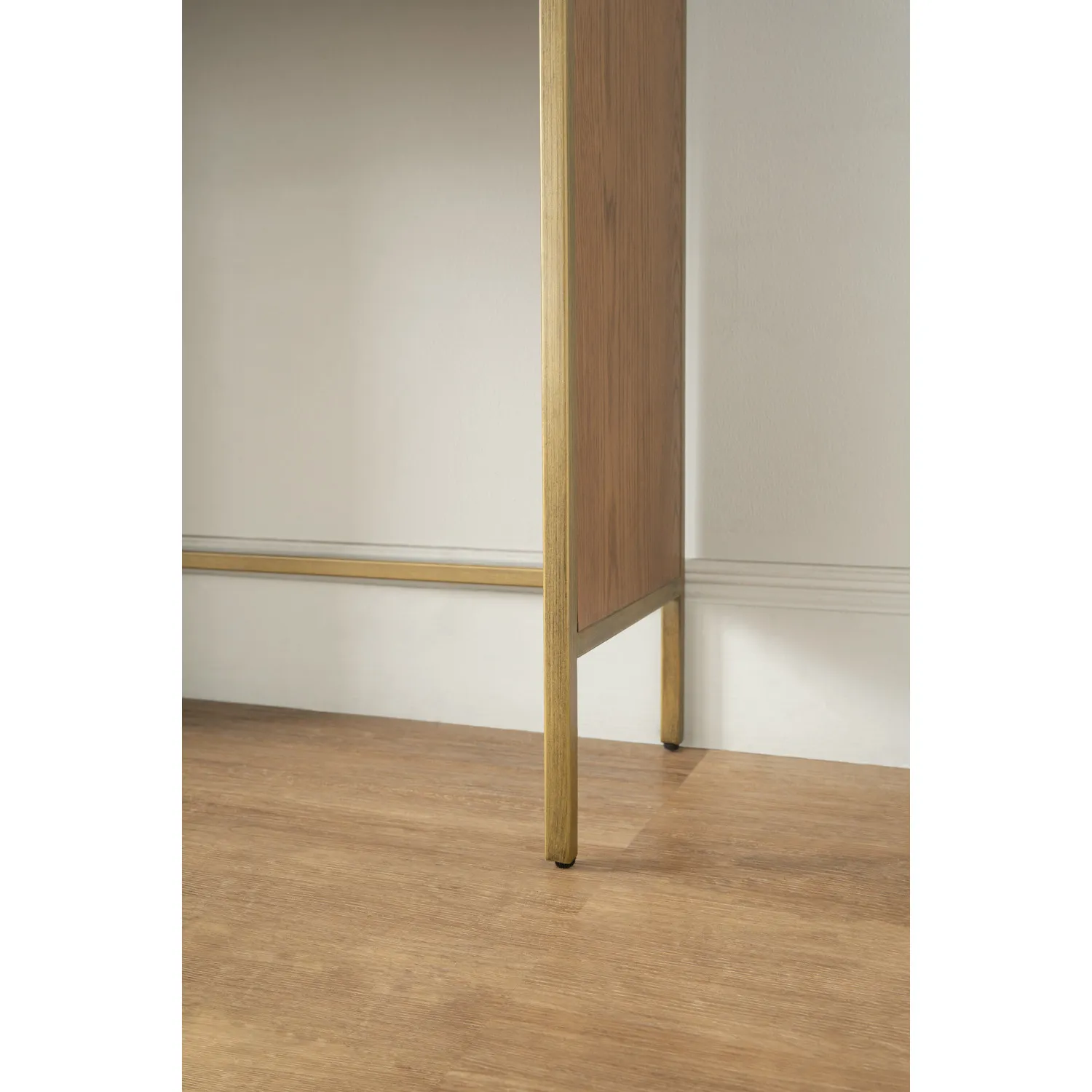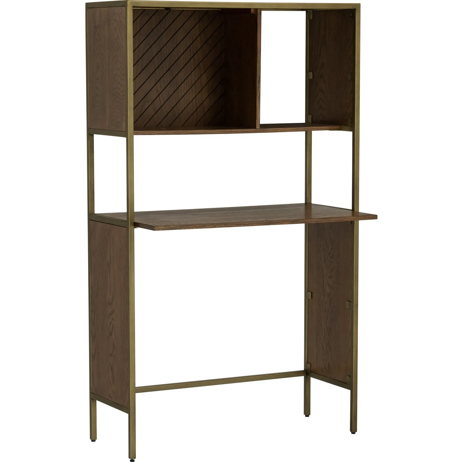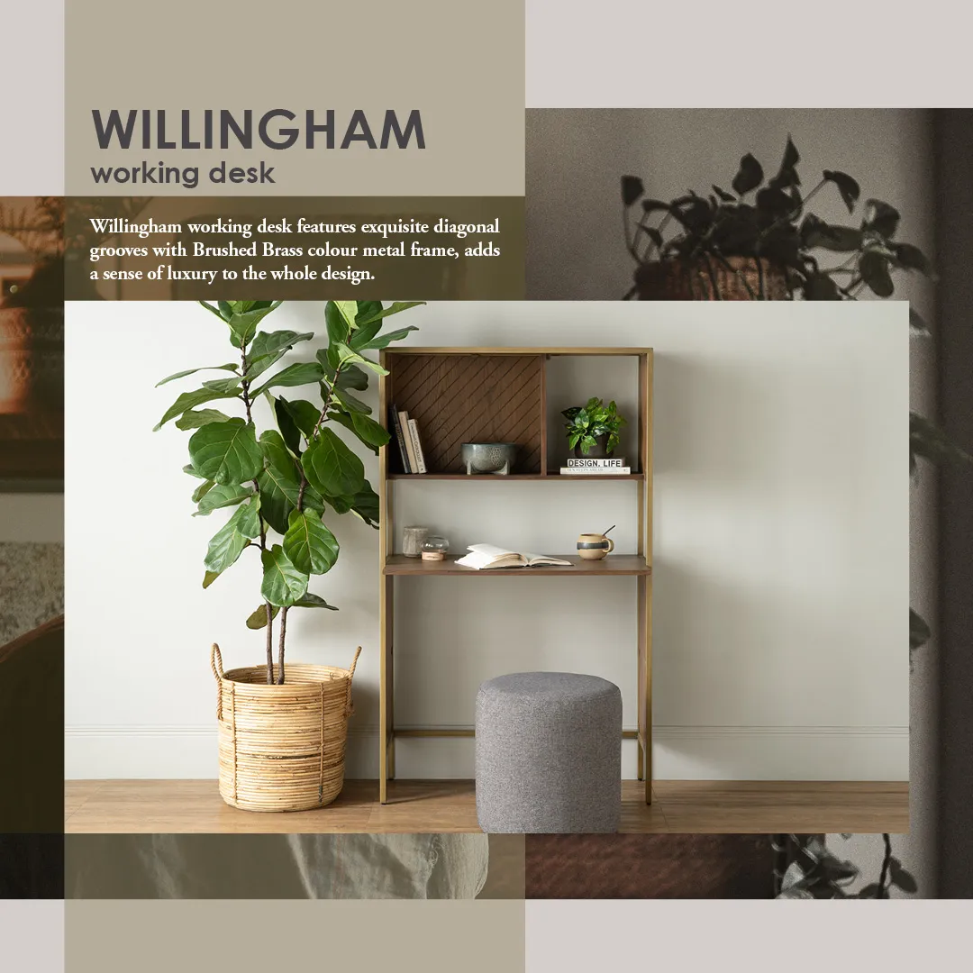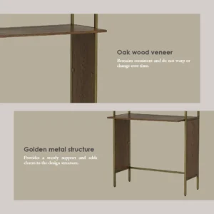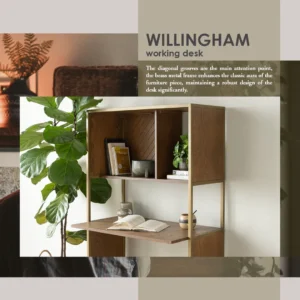 Willingham Working Desk with Brushed Brass colour frame, Boston Cherry colour top. The Willingham Working Desk is a statement piece that marries Mid-Century Modern elegance with Art Deco refinement. Built on a robust metal frame and enhanced with a rich oak veneer body, it combines strength with sophistication. The desk’s structured form and refined detailing make it a centerpiece for any stylish office or study. A tall and practical design provides both workspace and vertical storage opportunities, optimizing utility without sacrificing aesthetics. The subtle metallic accents elevate the piece, giving it a distinctive character that works beautifully in high-end residential or boutique commercial interiors. Elegant and purposeful, the Willingham Working Desk brings a touch of luxury to everyday productivity.