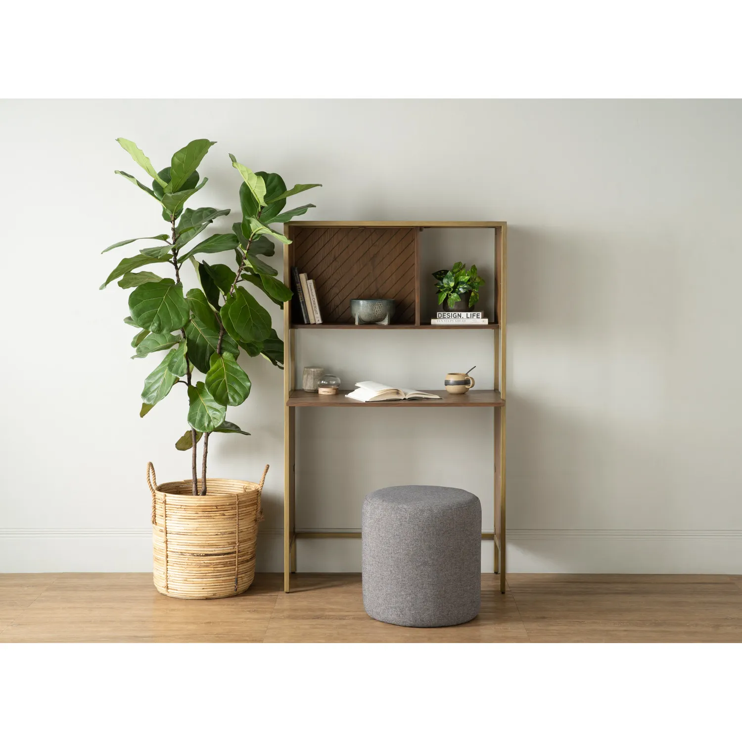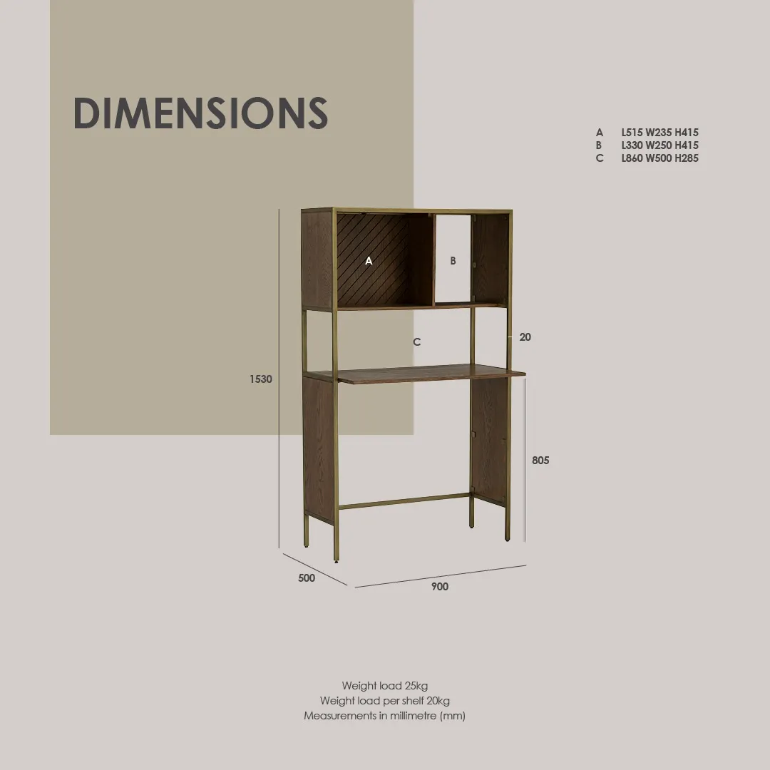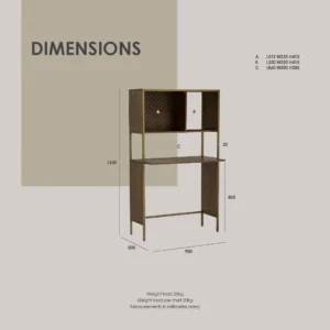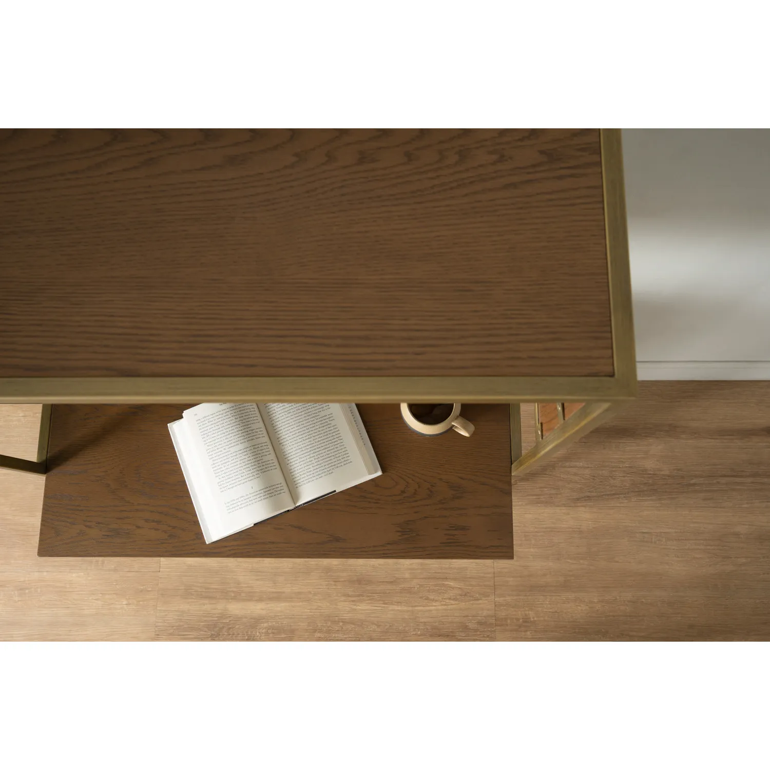 Willingham Working Desk with Brushed Brass colour frame, Boston Cherry colour top. The Willingham Working Desk is a statement piece that marries Mid-Century Modern elegance with Art Deco refinement. Built on a robust metal frame and enhanced with a rich oak veneer body, it combines strength with sophistication. The desk’s structured form and refined detailing make it a centerpiece for any stylish office or study. A tall and practical design provides both workspace and vertical storage opportunities, optimizing utility without sacrificing aesthetics. The subtle metallic accents elevate the piece, giving it a distinctive character that works beautifully in high-end residential or boutique commercial interiors. Elegant and purposeful, the Willingham Working Desk brings a touch of luxury to everyday productivity.