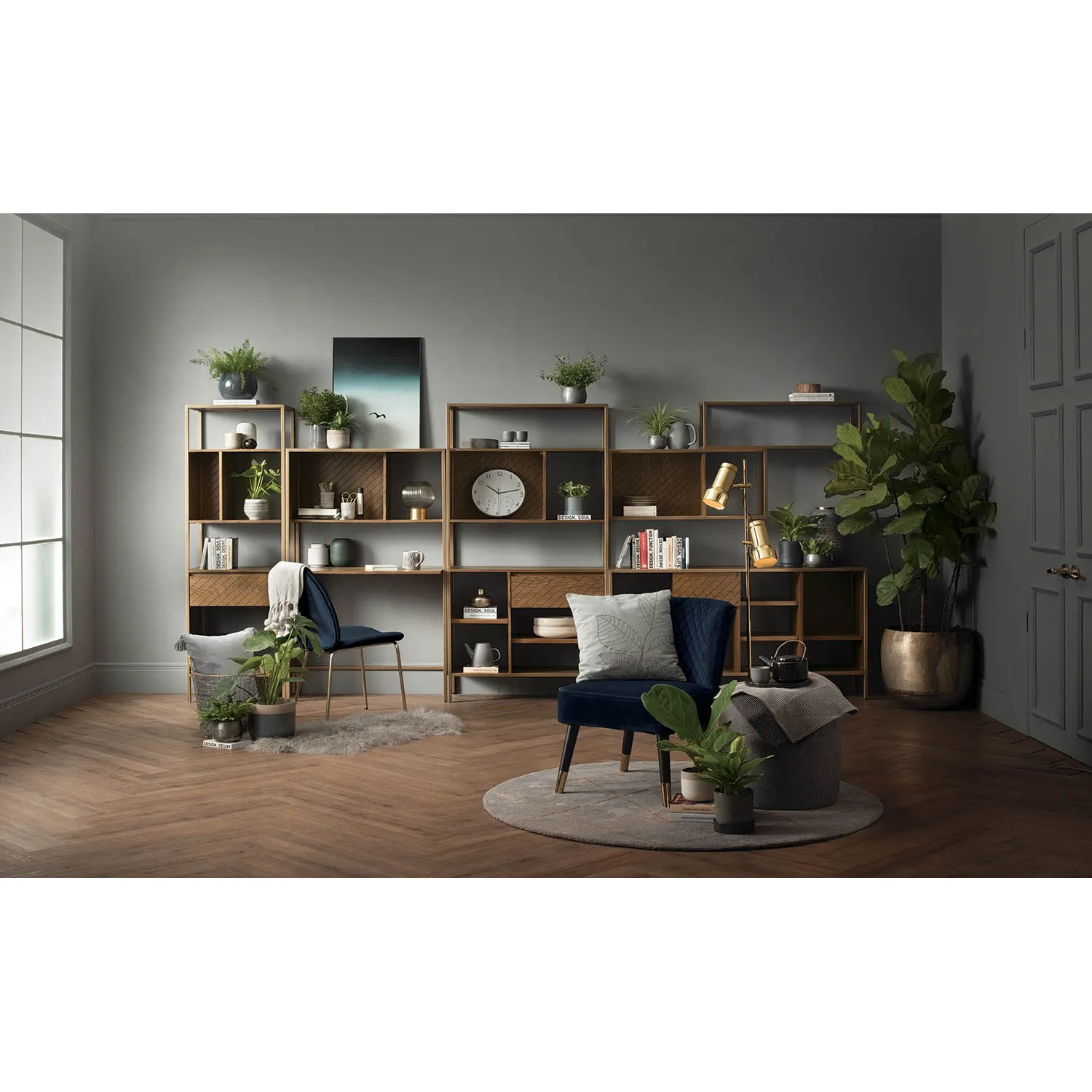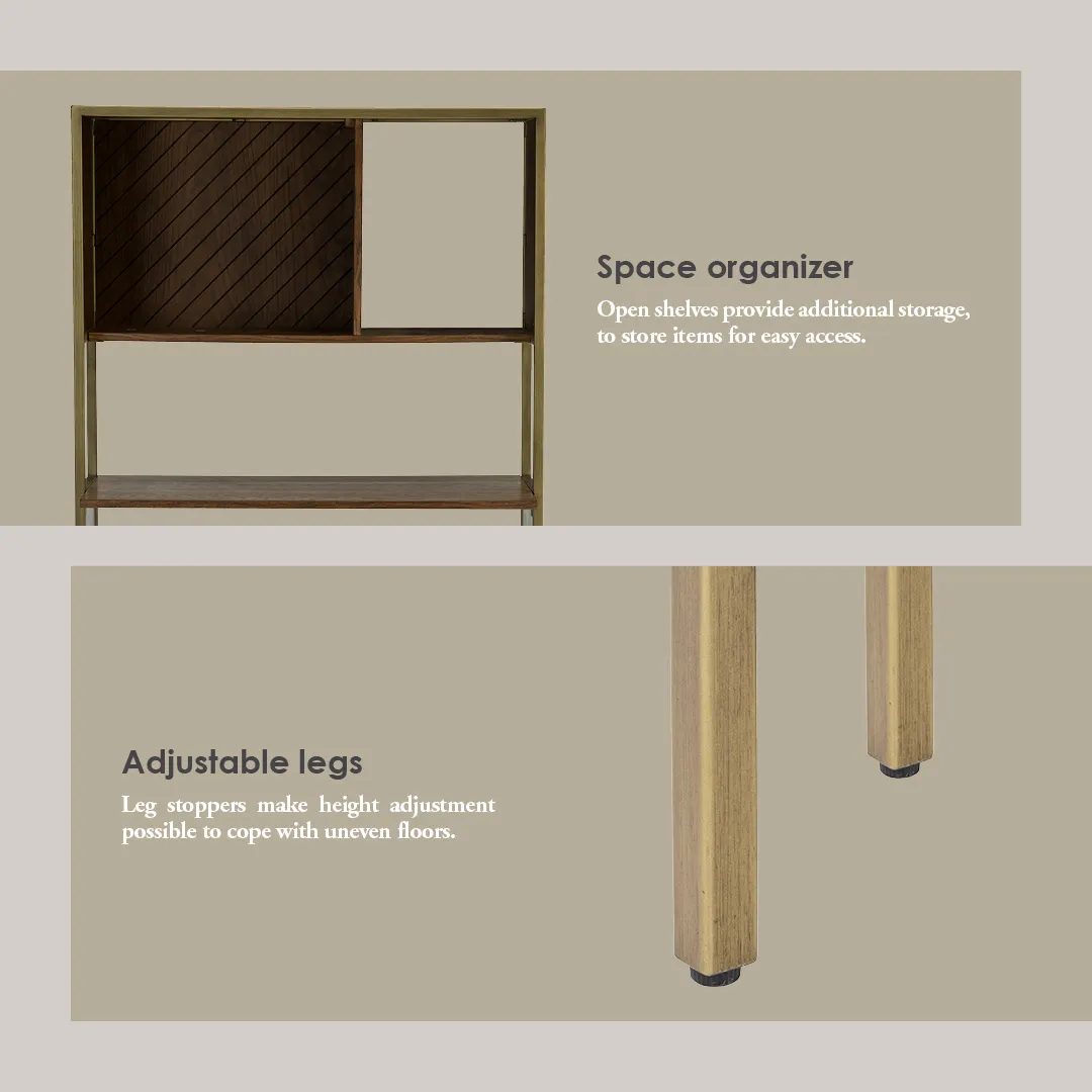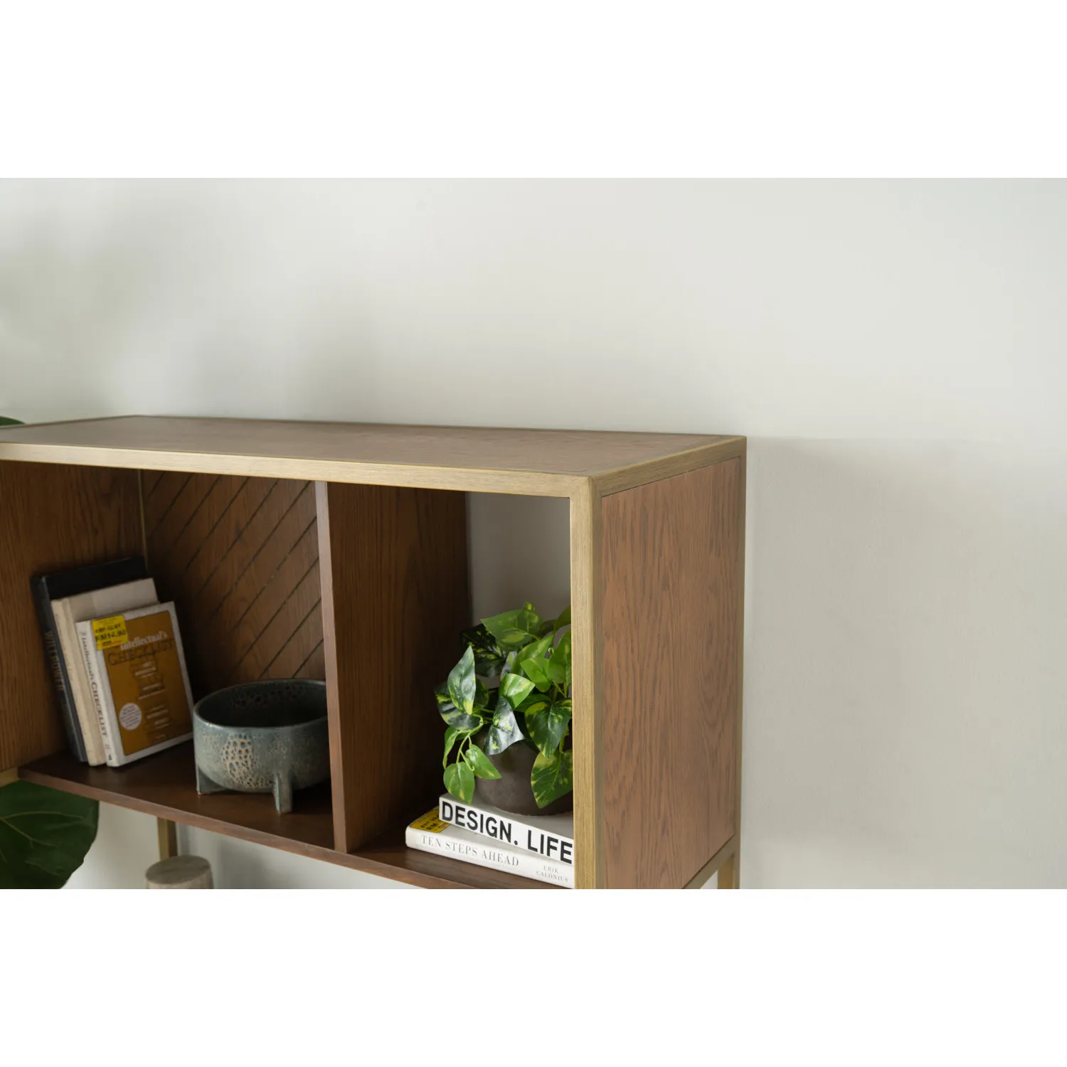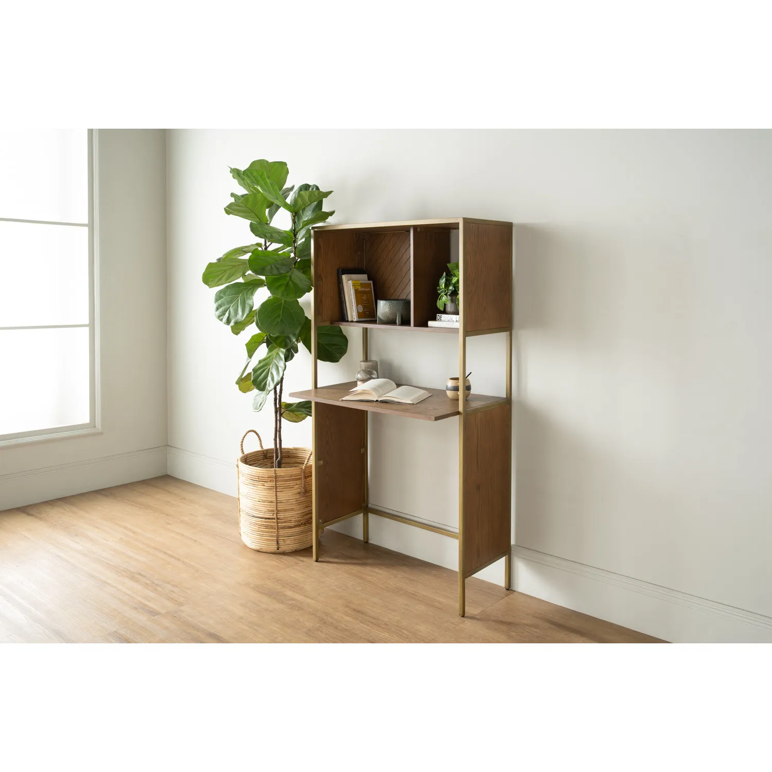 Willingham Working Desk with Brushed Brass colour frame, Boston Cherry colour top. The Willingham Working Desk is a statement piece that marries Mid-Century Modern elegance with Art Deco refinement. Built on a robust metal frame and enhanced with a rich oak veneer body, it combines strength with sophistication. The desk’s structured form and refined detailing make it a centerpiece for any stylish office or study. A tall and practical design provides both workspace and vertical storage opportunities, optimizing utility without sacrificing aesthetics. The subtle metallic accents elevate the piece, giving it a distinctive character that works beautifully in high-end residential or boutique commercial interiors. Elegant and purposeful, the Willingham Working Desk brings a touch of luxury to everyday productivity.